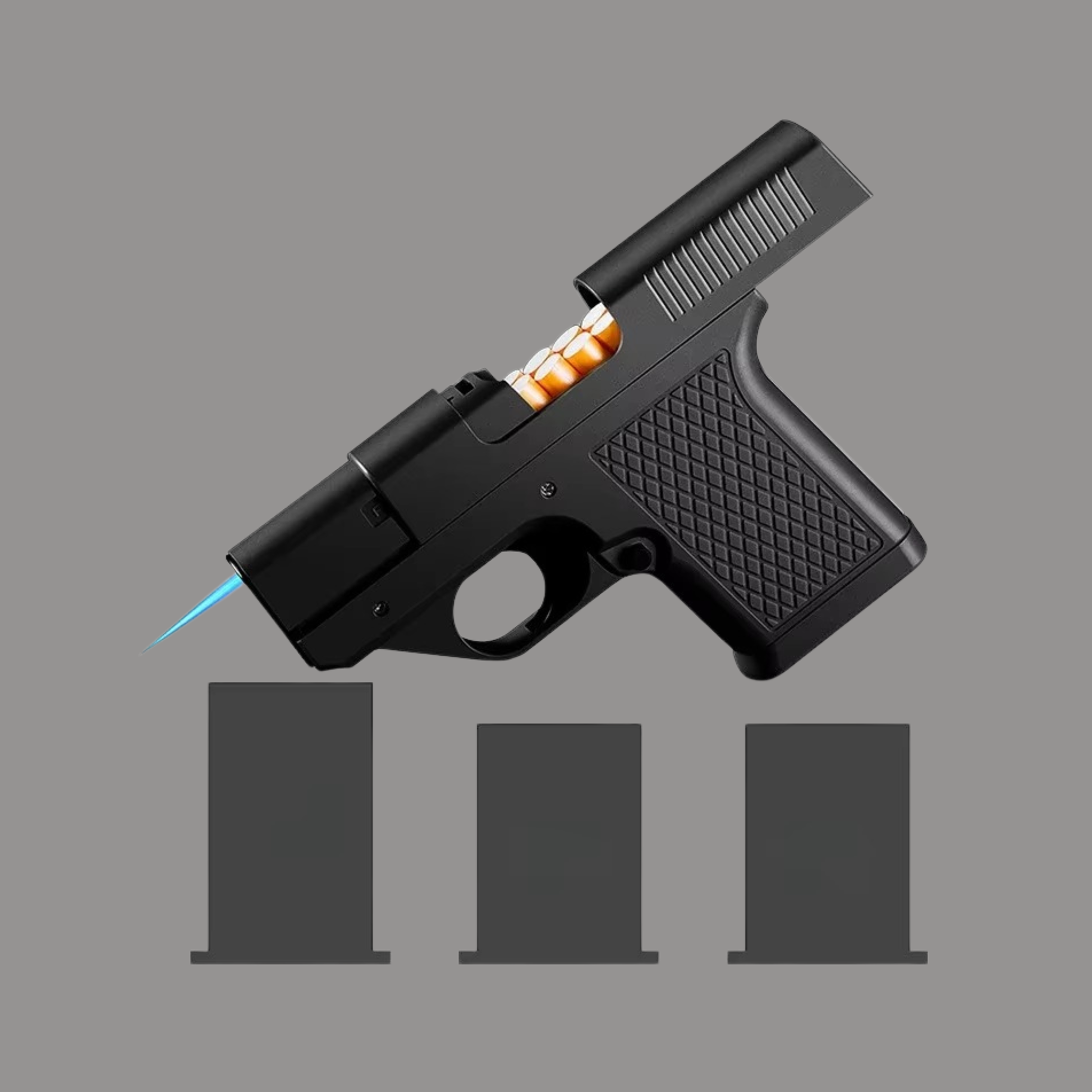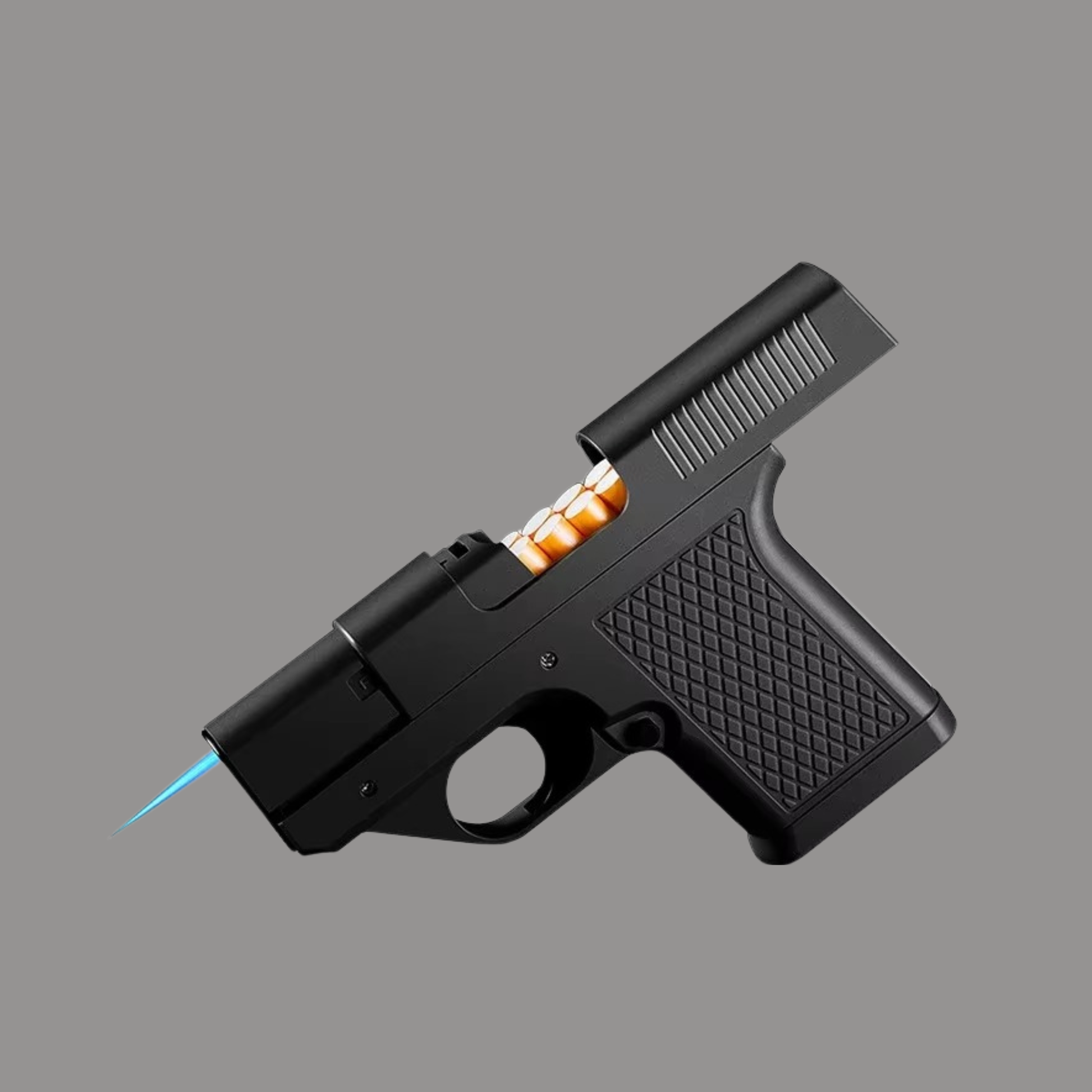 A Gun Lighter in Your Pocket! Feel the cool rush of a blue flame spark that lights your smoke with style using our Puff-Shot Gun Lighter!